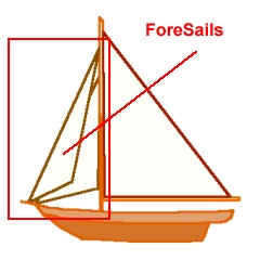 | Foresails are rigged in front of the fore mast and attached to the bow. |